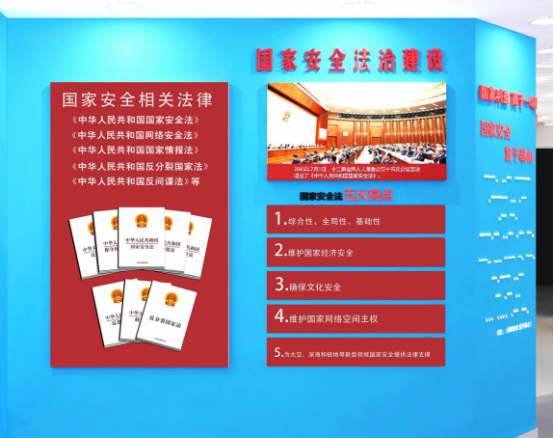 展廳一:展示了“總體國家安全觀”的誕生、內容、體系、制度、法律等內容,讓游客從整體上把握“總體國家安全觀”。