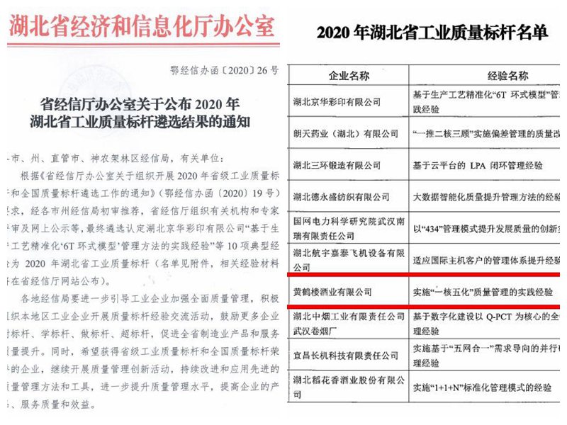 近日,湖北省經(jīng)信廳公布2020年湖北省工業(yè)質(zhì)量標(biāo)桿遴選結(jié)果,黃鶴樓酒業(yè)提報(bào)的“實(shí)施‘一核五化’質(zhì)量管理的實(shí)踐經(jīng)驗(yàn)”榮獲湖北省質(zhì)量標(biāo)桿。
