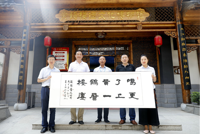 溫明春一行參觀了酒文化博物館、天成坊釀造車間、名人酒窖和黨建文化館等景點。在酒文化博物館,余建華向黃鶴樓酒業(yè)捐贈中國國畫院副院長、書法院副秘書長夏才俊題寫的書法。