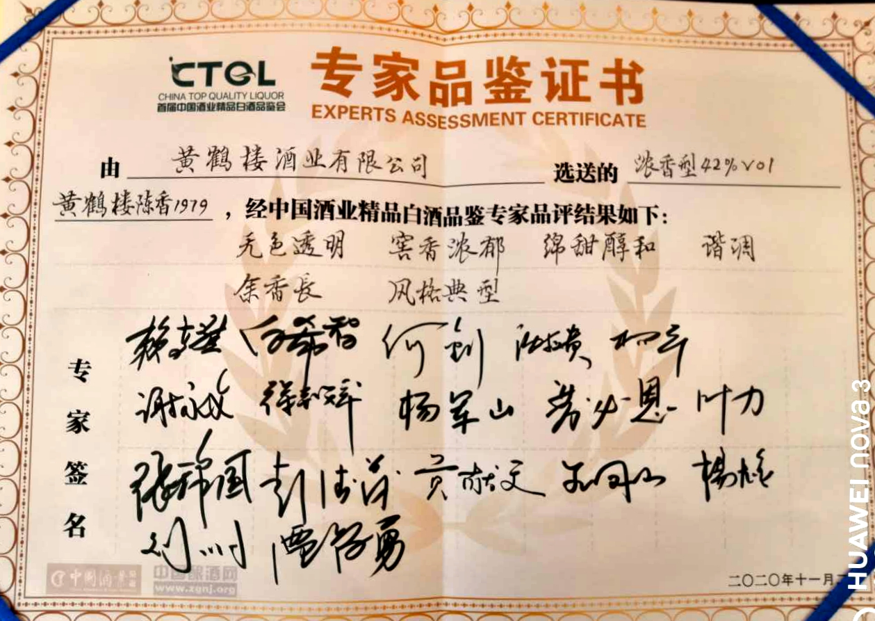 11月2日,首屆中國酒業精品白酒品鑒會在陜西西安召開,中國著名白酒專家賴高淮、白希智、何釗、丁易初、謝義貴、賈智勇、楊平、劉明、楊大金、王鳳仙、謝永文、葉力、徐欽祥、貢獻文、普必恩、趙德義、楊軍山、張鋒國共計18位名酒品鑒專家參加活動。活動遴選出20款精品白酒并頒發專家品鑒證書,黃鶴樓酒•陳香1979名列其中,并以其 “無色透明、窖香濃郁、綿甜醇和、諧調、余香長、風格典型”的特點獲得品鑒專家們高度評價。