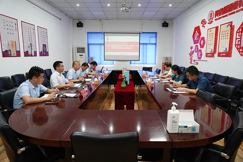6月9日,漢陽區商務局副局長楊雯娟、洲頭街紀工委書記高斌一行到黃鶴樓酒業調研企業現狀,了解企業難題。公司黨委委員、副總經理魏國參加座談會。