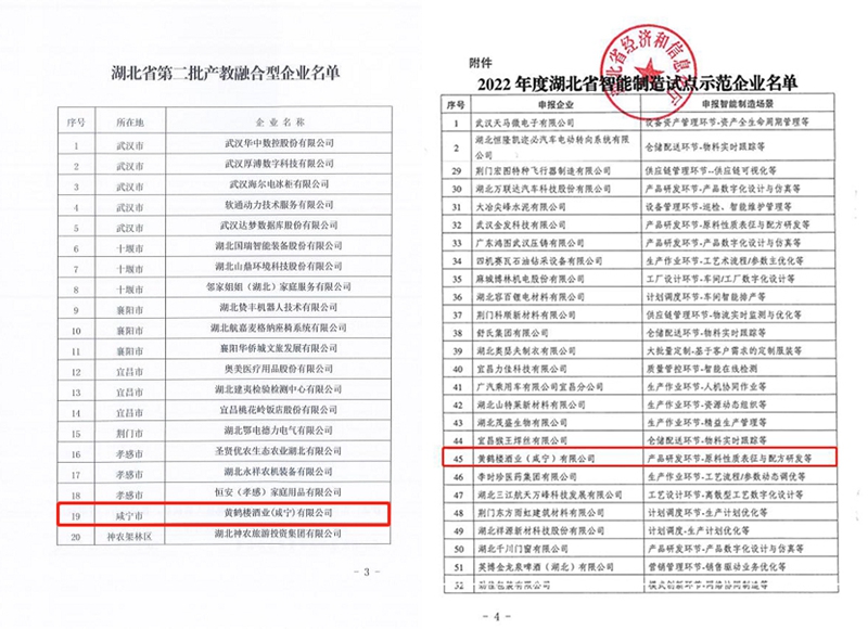 近日,公司喜訊不斷,捷報連連,黃鶴樓酒業(咸寧)有限公司分別成功入選《湖北省第二批產教融合型企業》及《2022年度湖北省智能制造試點示范企業》。