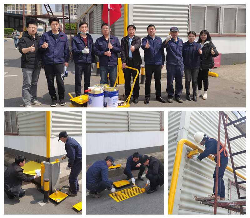 活動中,各黨員、積極分子化身“油漆工”,對武漢廠區天然氣管道、雨水井蓋及標識進行了重新噴漆。深入基層、服務基層,在做好防護的前提下,大家輕裝上陣,紛紛投入井蓋刷漆、登高刷漆、地面防護等作業任務。經過幾個小時的努力,廠區天然氣管道及雨水井蓋煥然一新,設施標識更加醒目。
