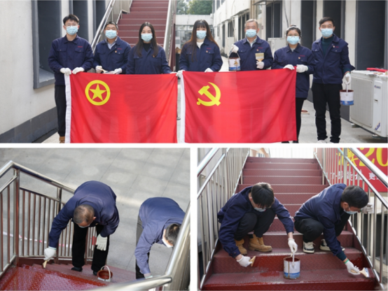 活動中,各黨員、積極分子輕裝上陣,挽起袖子、戴上手套,做好個人防護,化身“油漆工”,對武漢廠區辦公樓1號會議室出口樓梯及樓梯側面進行全面重新刷漆,大家齊心協力、分工合作,辦公樓樓梯煥然一新。