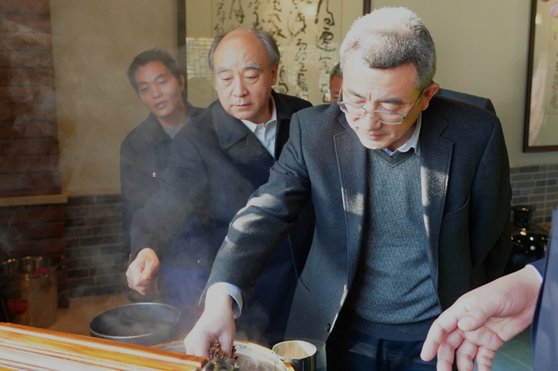 胡道銀一行參觀了天成坊釀造車間、名人酒窖、酒文化博物館等地,詳細(xì)了解了黃鶴樓酒業(yè)的發(fā)展歷程及企業(yè)規(guī)劃。在辛氏酒館,許鵬詳細(xì)介紹了黃鶴樓酒的釀造工藝與生產(chǎn)流程,并表示,黃鶴樓酒業(yè)以“一糧二曲三匠人”的匠心精神,精選優(yōu)質(zhì)糧食,恒溫恒濕洞藏洞釀,保證所釀美酒香味協(xié)調(diào)、純甜凈爽,以匠人之心釀造好酒,將楚酒品牌越打越響。隨后,胡道銀一行還親手體驗了白酒釀造過程,將酒糟均勻攤?cè)?,上甑蒸餾,釀制原酒。